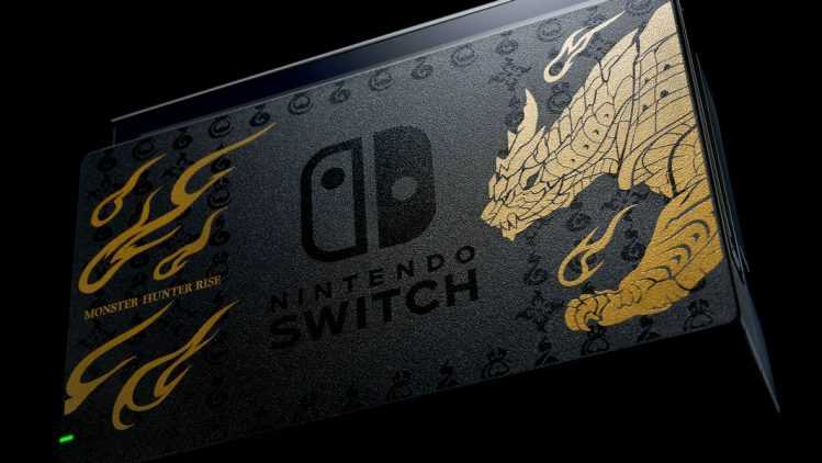 Die Nintendo Switch in der Monster Hunter Rise-Edition beinhaltet neben der Konsole auch einen Download-Code für das Videospiel sowie das Deluxe-Kit-DLC-Paket samt weiterer Bonusinhalte. Die Optik der neuen Sonderedition ist dabei an das Design des Spiel angepasst: Auf schlichtem Schwarz werden güldene und graue Akzente im Monster-Hunter-Stil gesetzt.